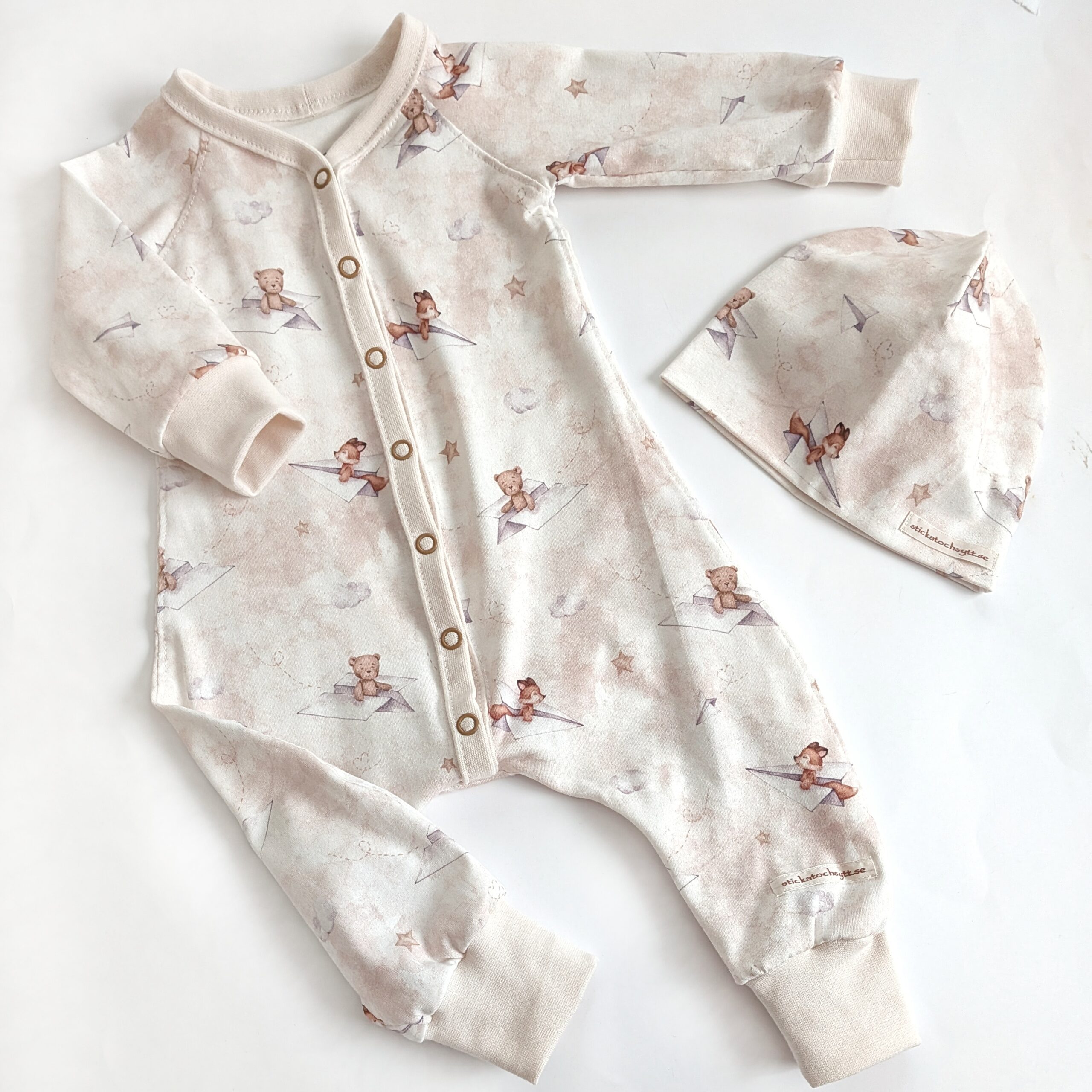 . 2-4 månader, storlek 62 – Baggydress + mössa, flygande nallar på beige
