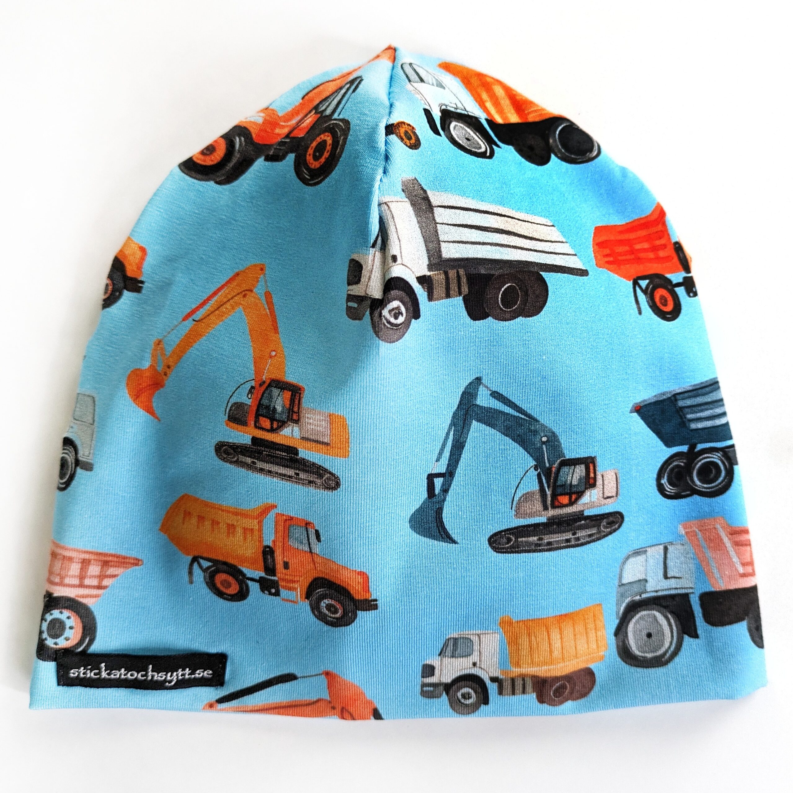 Mössa storlek 48/50, 1-2 år – Byggfordon på turkos