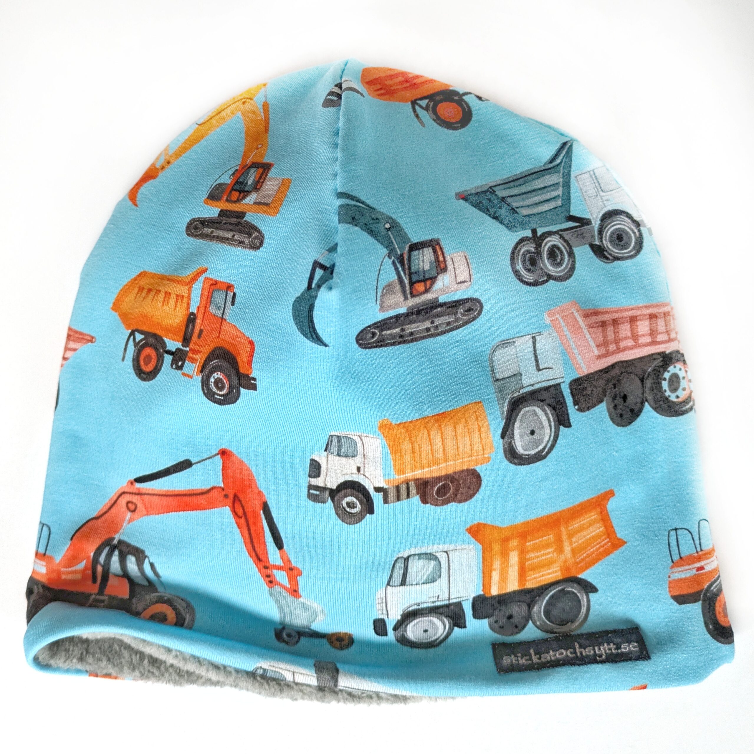 Mössa storlek 50/52, 2-4 år – Fleecefodrad mössa med byggfordon på turkos