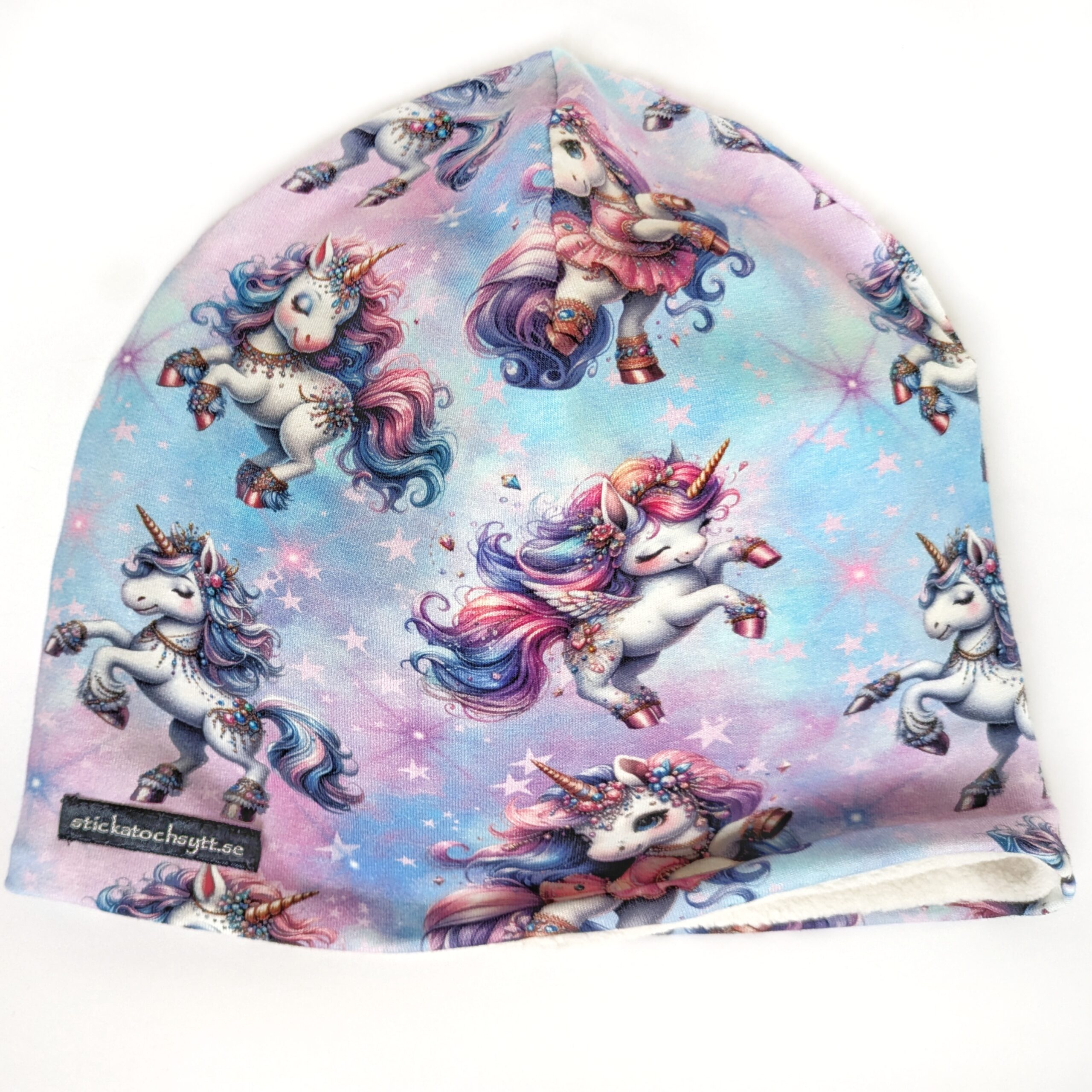 Mössa i bomullstrikå med vintervitt fleecefoder i 80 % bomull.