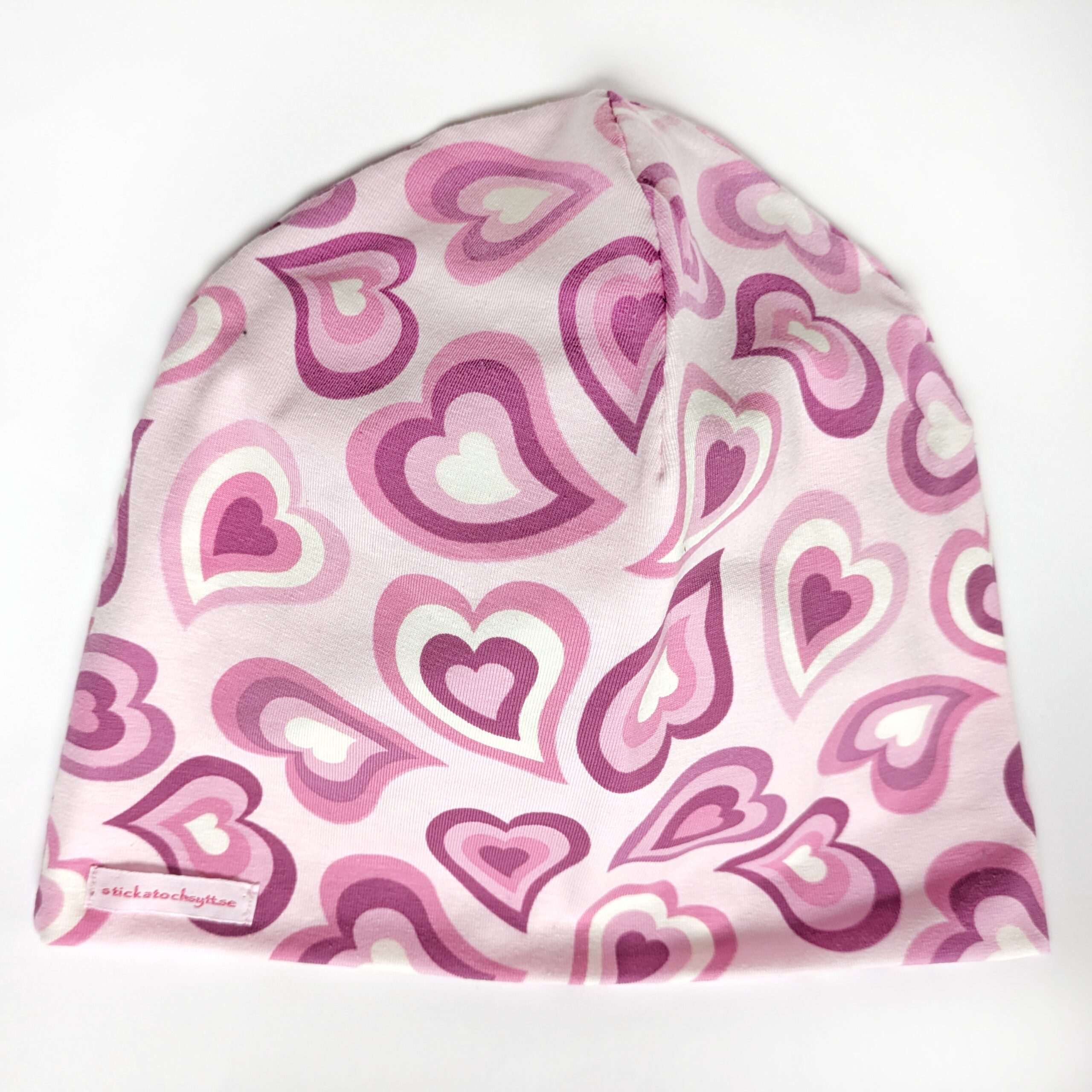 Mössa storlek 54/56, 6-8 år – Rosa hjärtan